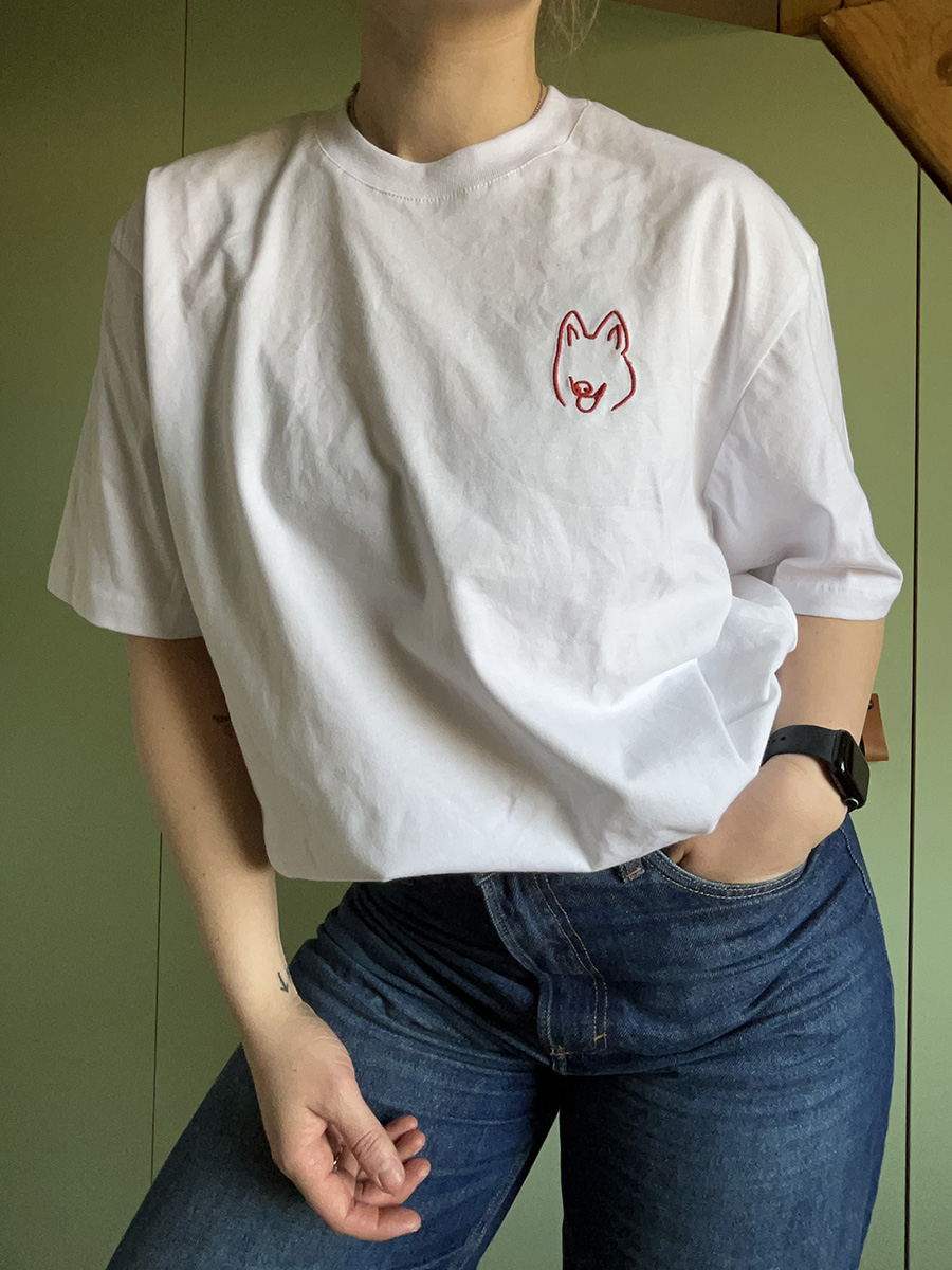 Een hip, oversized shirt met een koppie van een herdershond, of een retriever.